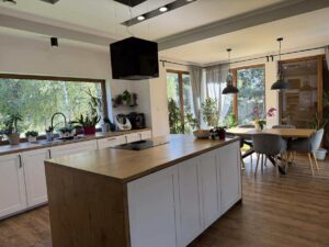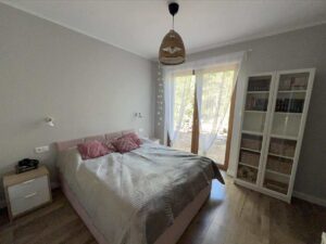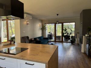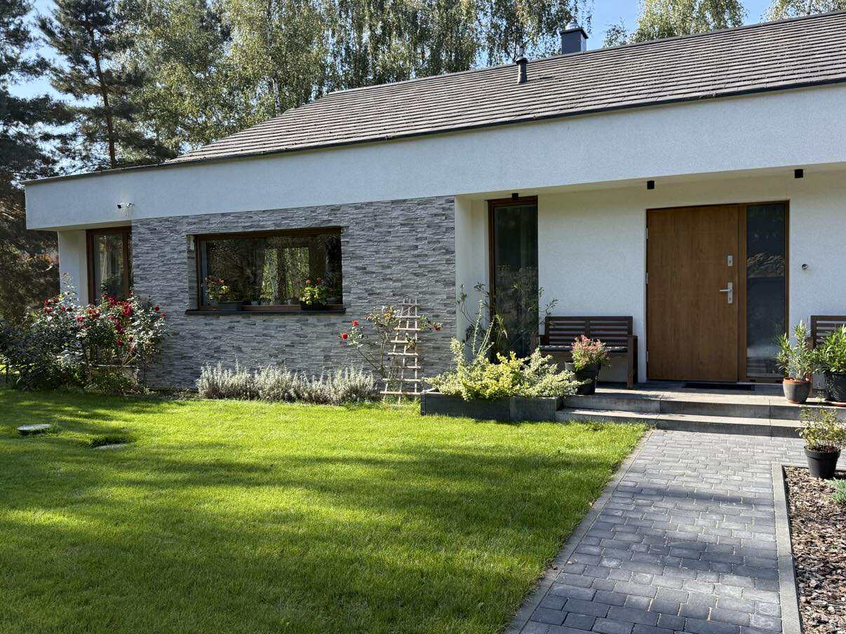 Piękny nowoczesny dom z 2019r. o powierzchni 124.5m2 , położony na działce 15 ar z licznymi nasadzeniami drzew- sosen, brzóz, krzewów, roślin ozdobnych, bylin. Duże przeszklenia nieruchomości pozwalają również nawet z zacisza domowego obserwować piękno otaczającej przyrody.