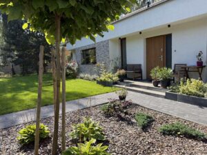 Całość działki ogrodzona, kostka brukowa przed domem i garażem, częściowe automatyczne nawadnianie ogrodu, taras około 45m2.