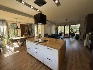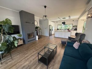 Media: woda- miejska, przydomowa oczyszczalnia, instalacja elektryczna 3-fazowa, ogrzewanie podłogowe- pompa ciepła, kominek, rekuperacja Thessla Green, klimatyzacja w salonie.